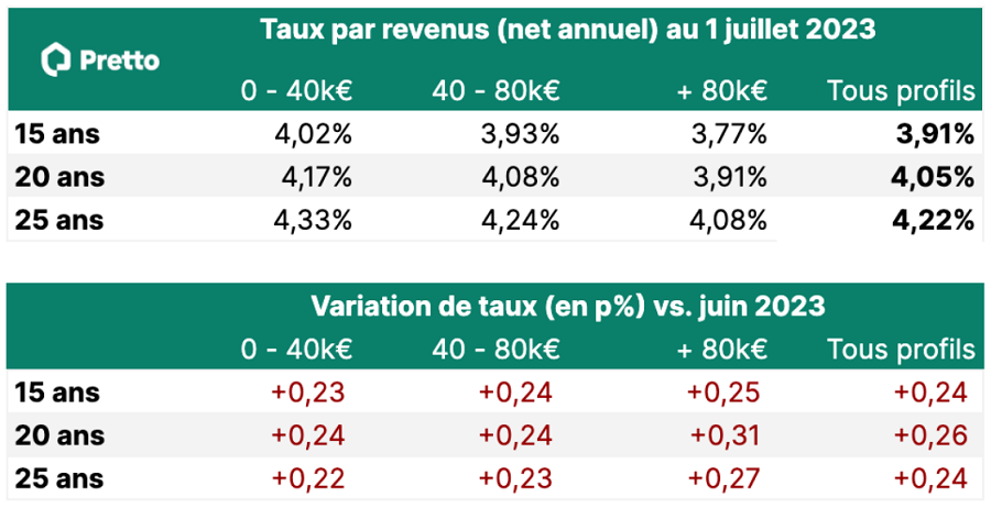 Dans le sillage de cette évolution, les taux de crédit immobilier pratiqués par les banques évoluent plus progressivement, mais toujours à la hausse. Sur 20 et 25 ans, la moyenne des taux dépasse pour la première fois la barre des 4% pour le mois de juillet. Les meilleurs profils obtiendront des taux autour des 4,08% sur 25 ans et 3,91% sur 20 ans.