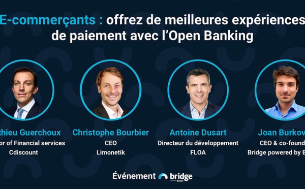 Regardez le replay du webinar Bridge sur le thème des expériences de paiement e-commerce et de l'Open Banking. Avec la participation d'invités experts : ● Mathieu Guerchoux, Director of Financial services, Cdiscount ● Antoine Dusart, Directeur du développement, Floa ● Christophe Bourbier, CEO,...