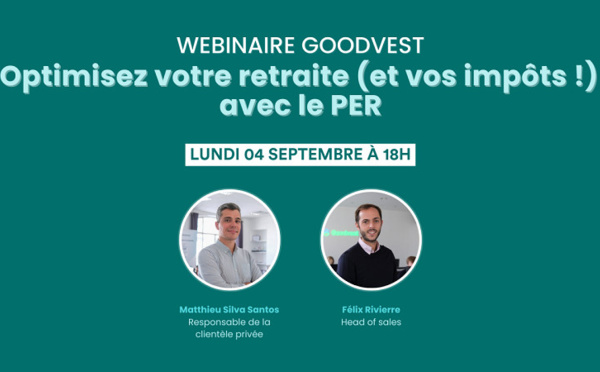 Rendez-vous le lundi 04 septembre 2023, à 18h pour notre webinaire exclusif "Optimisez votre retraite (et vos impôts) avec le PER Goodvest". Matthieu Silva Santos, responsable de la clientèle privée, et Félix Rivierre, Head of Sales chez Goodvest, seront vos guides pour explorer les stratégies et...